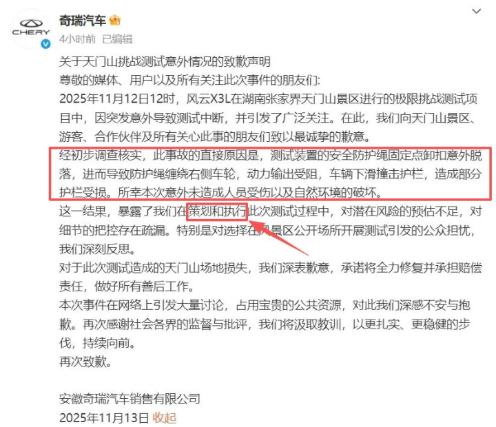 奇瑞此次挑战的风云X3L虽未能成功,但其官方在13号凌晨发布致歉声明,将原因指向活动策划和执行的不足。在汽车市场竞争激烈的当下,主机厂通过极限挑战提升品牌热度并不罕见,从捷豹飞跃摩天轮到宝马X3攀登武隆天坑,这类事件性营销早已成为行业常态。奇瑞作为国产车企,想要通过天门山挑战证明自身越野实力,这一初衷值得理解。此次失利更多是执行层面的疏漏,而非挑战行为本身存在违规之处。